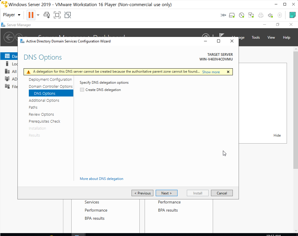 15. 다음 페이지 (DNS 옵션)에서 "권한있는 상위 영역 네임 서버를 찾을 수 없기 때문에 이 DNS 서버에 대한 위임을 만들 수 없습니다"라는 오류가 맨 위에 표시 될 것입니다. 무시하고 Next 해주자