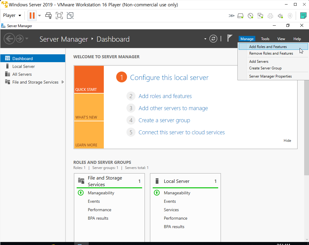 2. Manage > Add Roled and Features 를 클릭해주자.