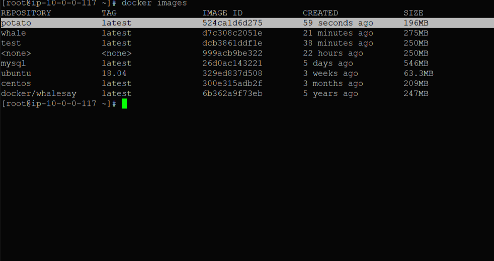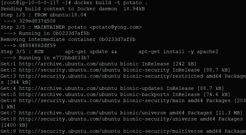 -t 옵션을 통해 이미지의 이름을 potato 으로 설정한다. 그리고 Dockerfile이 저장되어 있는 현재경로를 입력해준다