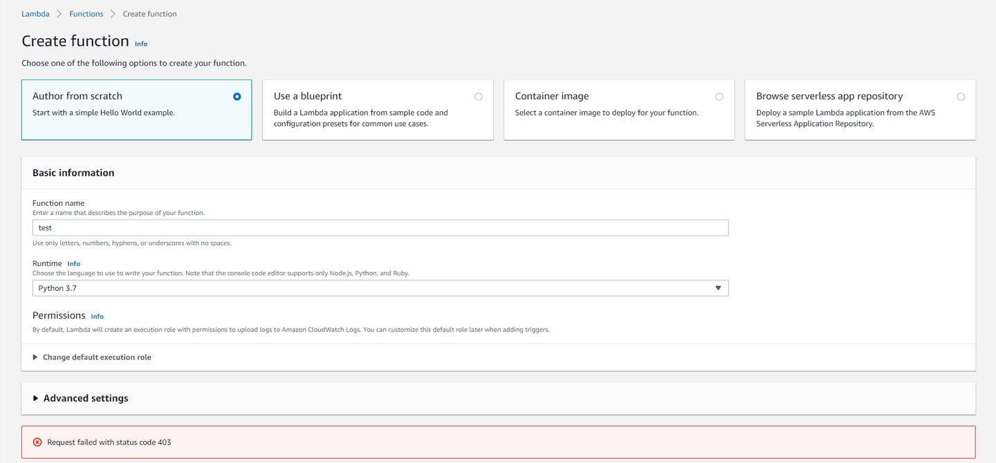 어느날 Lambda를 통한 실습을 진행하려고 했는데 아래와 같이 "Request failed with status code 403" 에러가 뜨면서