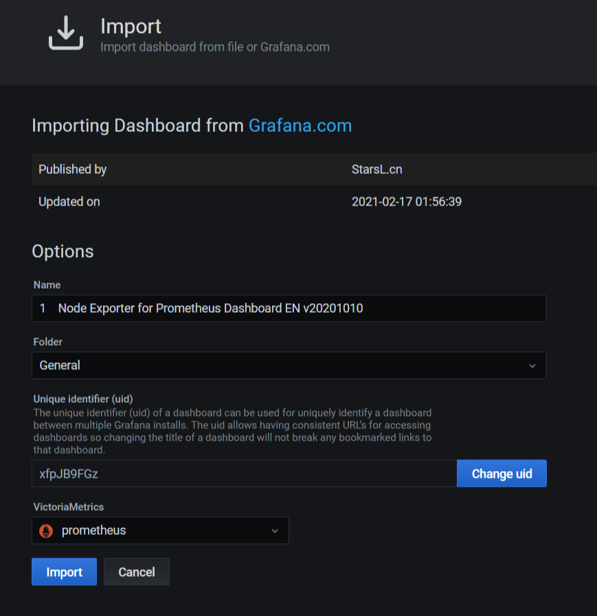 3. Grafana 공식 홈페이지에서 원하는 템플릿의 ID를 Grafana에 입력한 뒤, Load를 클릭하여 Import 할 수 있다.