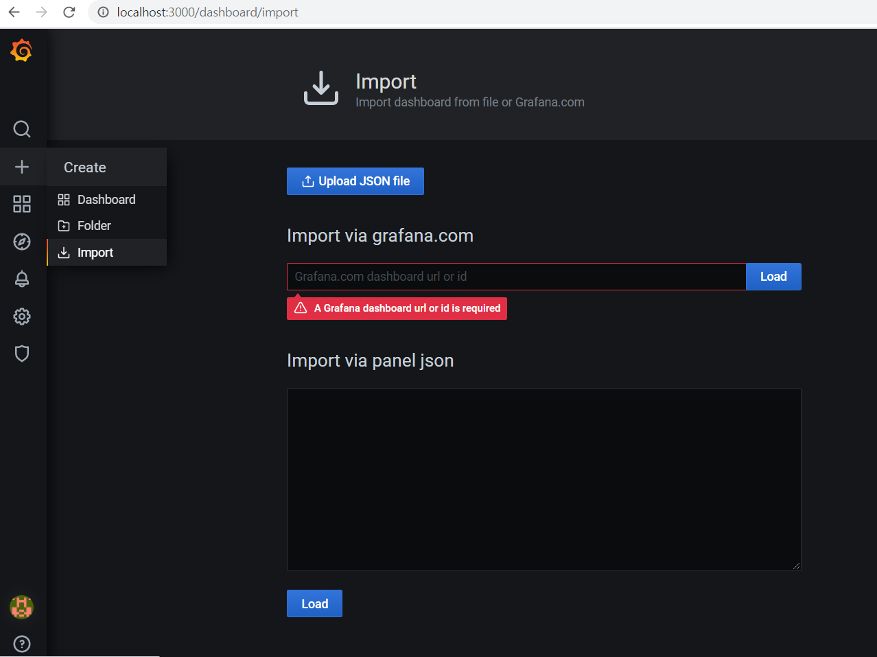 2. 왼쪽 메뉴창에서 Create > Import에서 대시보드 템플릿을 업로드할 수 있다.