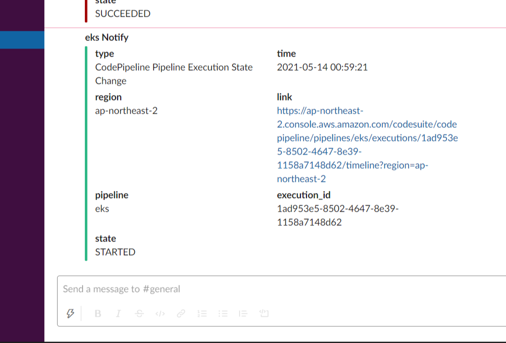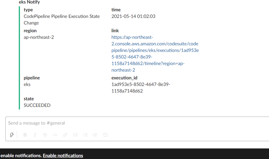 이제 마지막으로 Pipeline이 실행될 때, Slack으로 알림 메시지가 오는지 확인해주자.