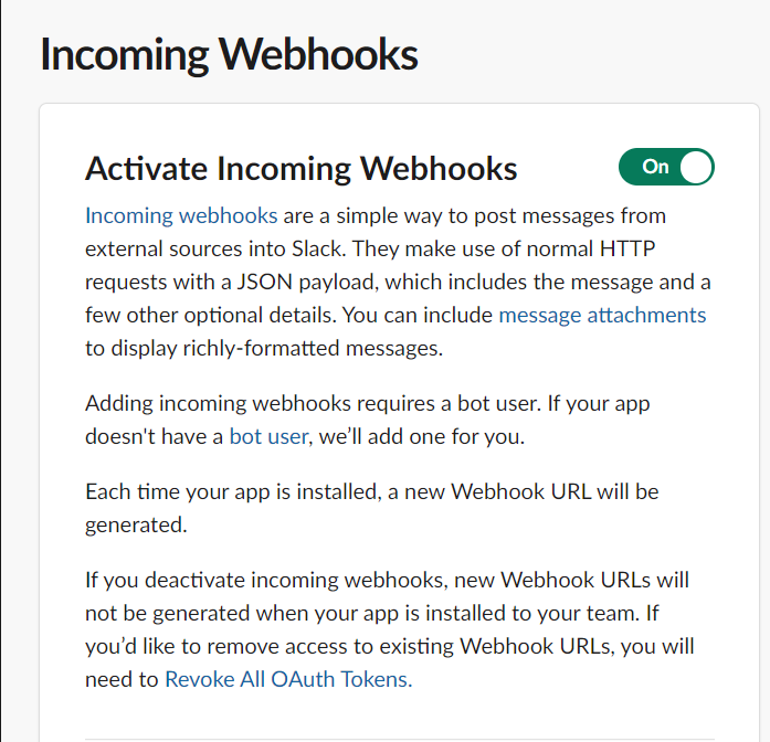 5. Webhooks 을 활성화 시키고, 하단의 'Add New Webhook to Workspace'을 클릭해 알람을 받을 채널을 선택한다.