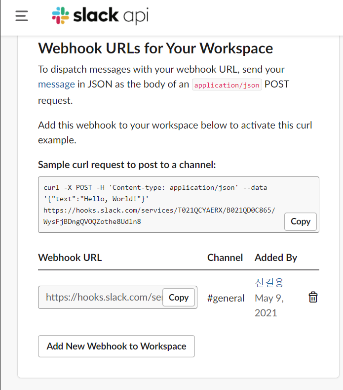 6. 그러면 해당 채널에 Webhooks URL이 생성되는데 이 URL은 나중에 Lambda 함수를 생성할 때, Lambda 함수에서 Slack으로 알람을 보내는데에 사용된다. 잘 적어두도록 하자.