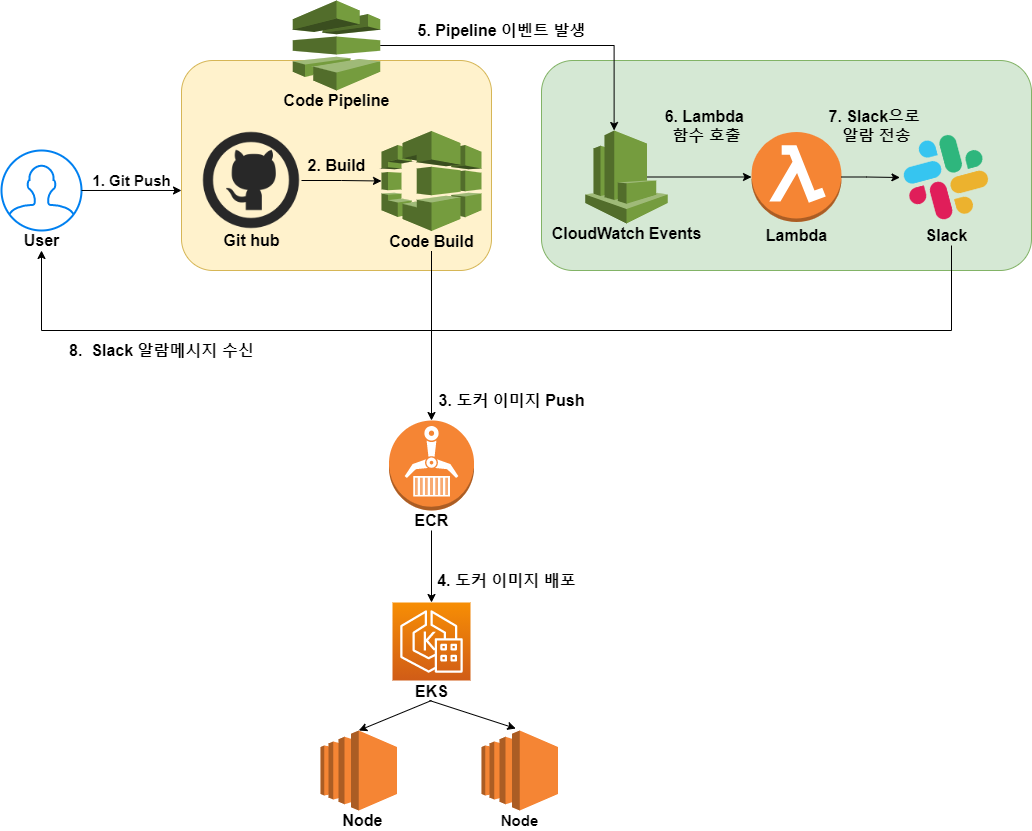 이번에 해볼 실습은 지난 글에서 구축했던 EKS 클러스터를 사용하여 AWS Code Pipeline로 CI/CD를 구축하고 이벤트가 발생할 때마다 Slack으로 사용자에게 알람 메시지가 수신되도록 해보는것이다.