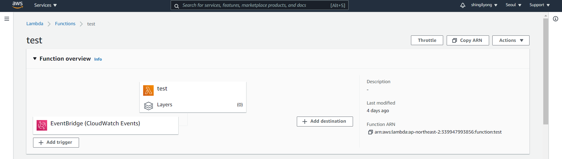 5. CloudWatch Events 가 생성이 되었으면 다시 Lambda로 돌아가서 Lambda와 CloudWatch Event가 연결되어 있는지 확인해주자.