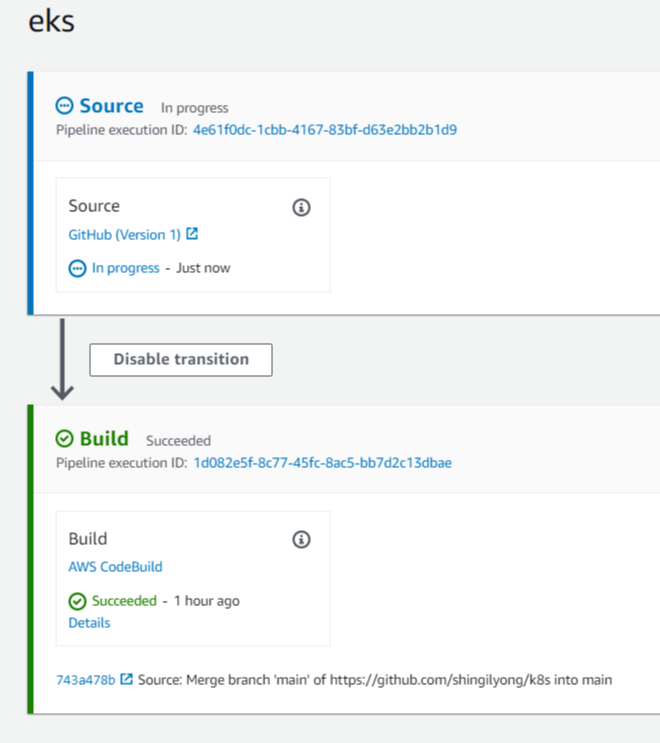 2. CodePipe의 Source 단계가 시작되는것을 확인해주자
