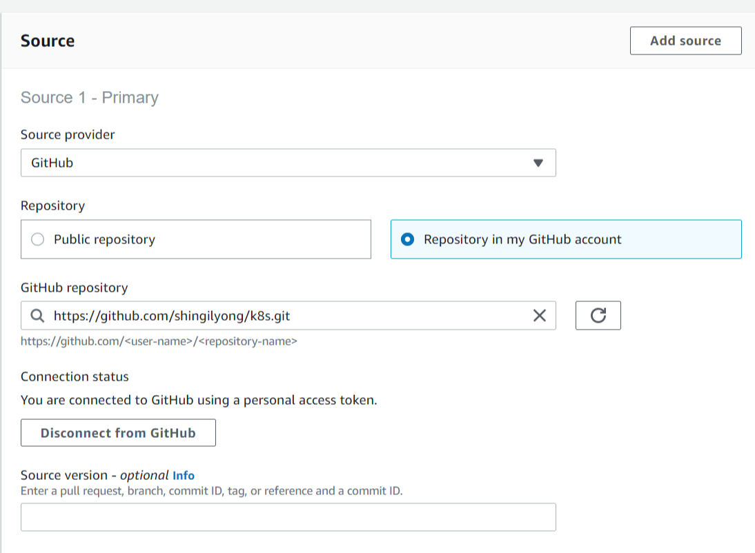 3. Source provider를 GitHub를 지정하고 Github에 인증하여 이전에 생성해둔 Repository를 사용하도록 한다.