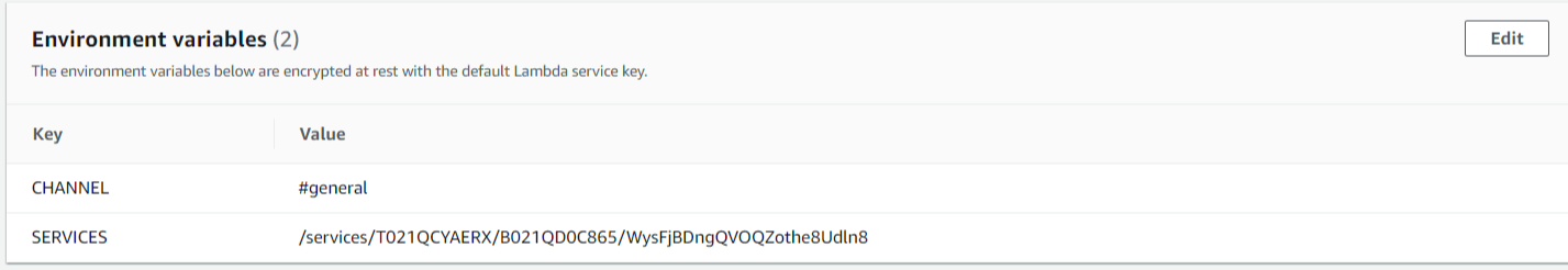 3. Lambda 환경 변수에 Slack 알람을 보낼 채널과 아까 생성했던 Webhooks URL 의 /services 부터 적어준다
