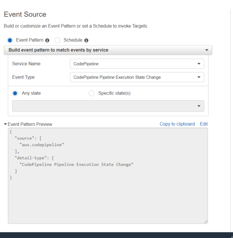 Event Type에서 CodePipeline의 상태가 변경되면 트리거가 발생하도록 한다.