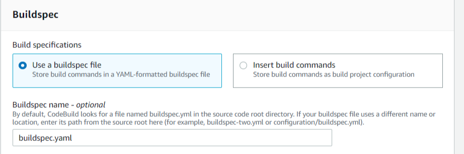 6. Buildspec은 Codebuild가 빌드시 참조하는 스크립트 파일이다. buildspec.yaml 이라고 지정하고 codebuild 프로젝트를 생성한다.