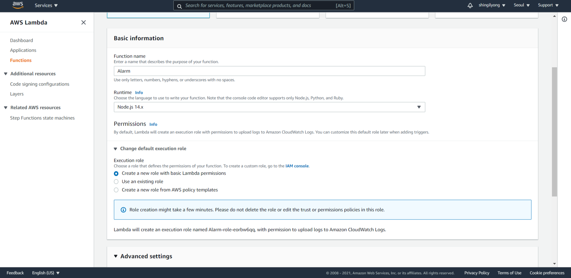 2. Fuction name을 입력해주고 Lambda에 사용할 런타임 언어를 정해주자.