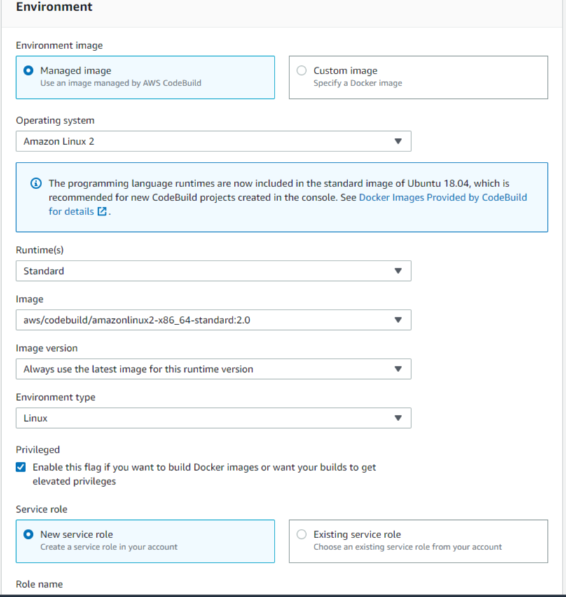 3. Environment 에서는 아래와 같이 설정해준다. CodeBuild에서 도커 빌드를 진행할 예정이기 때문에 Privileged를 체크해준다.
