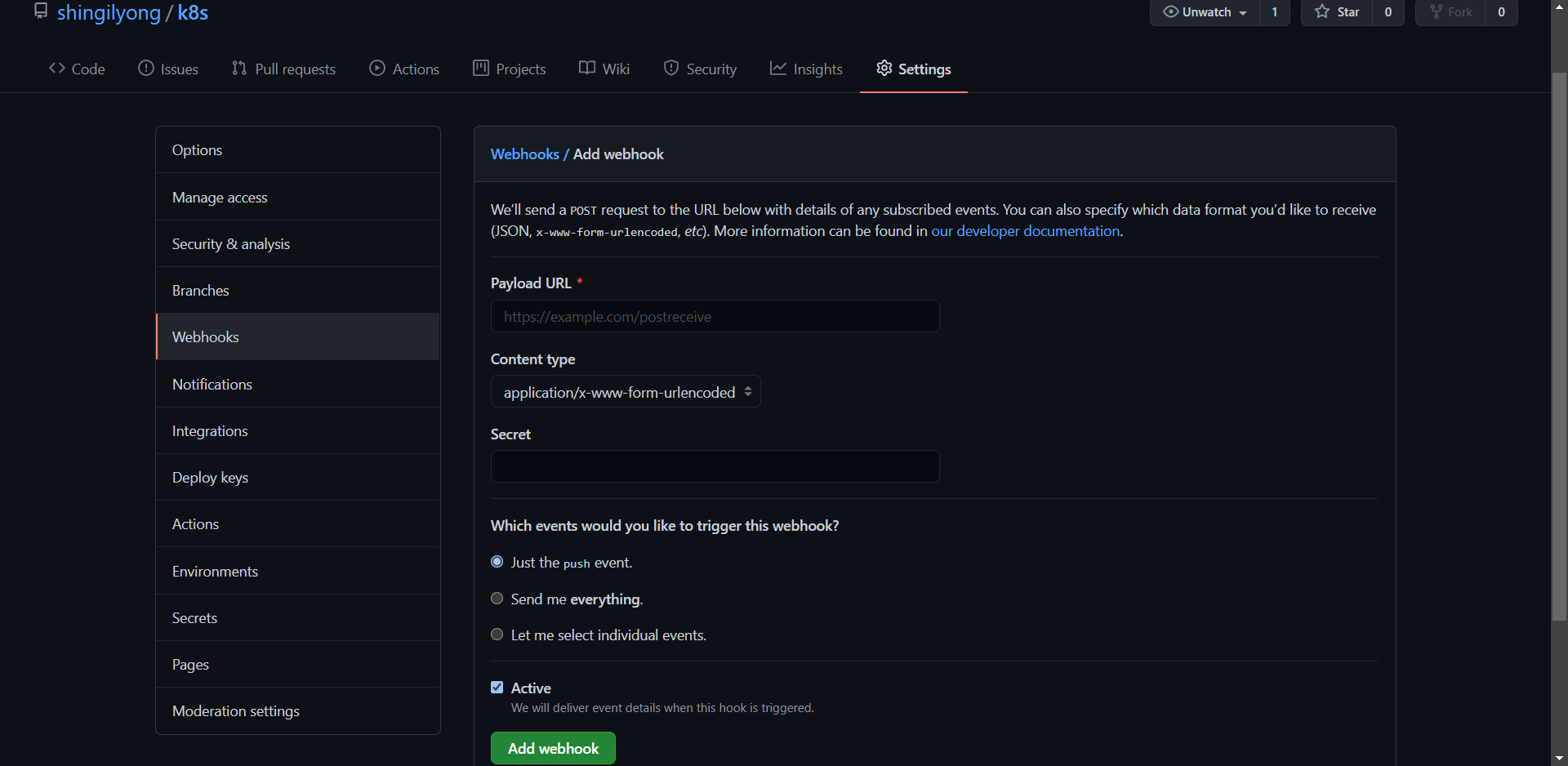 Jenkins에 사용한 git repository에서 Settings > Webhooks > Add Webhook 을 클릭하여 Webhooks을 추가해준다.