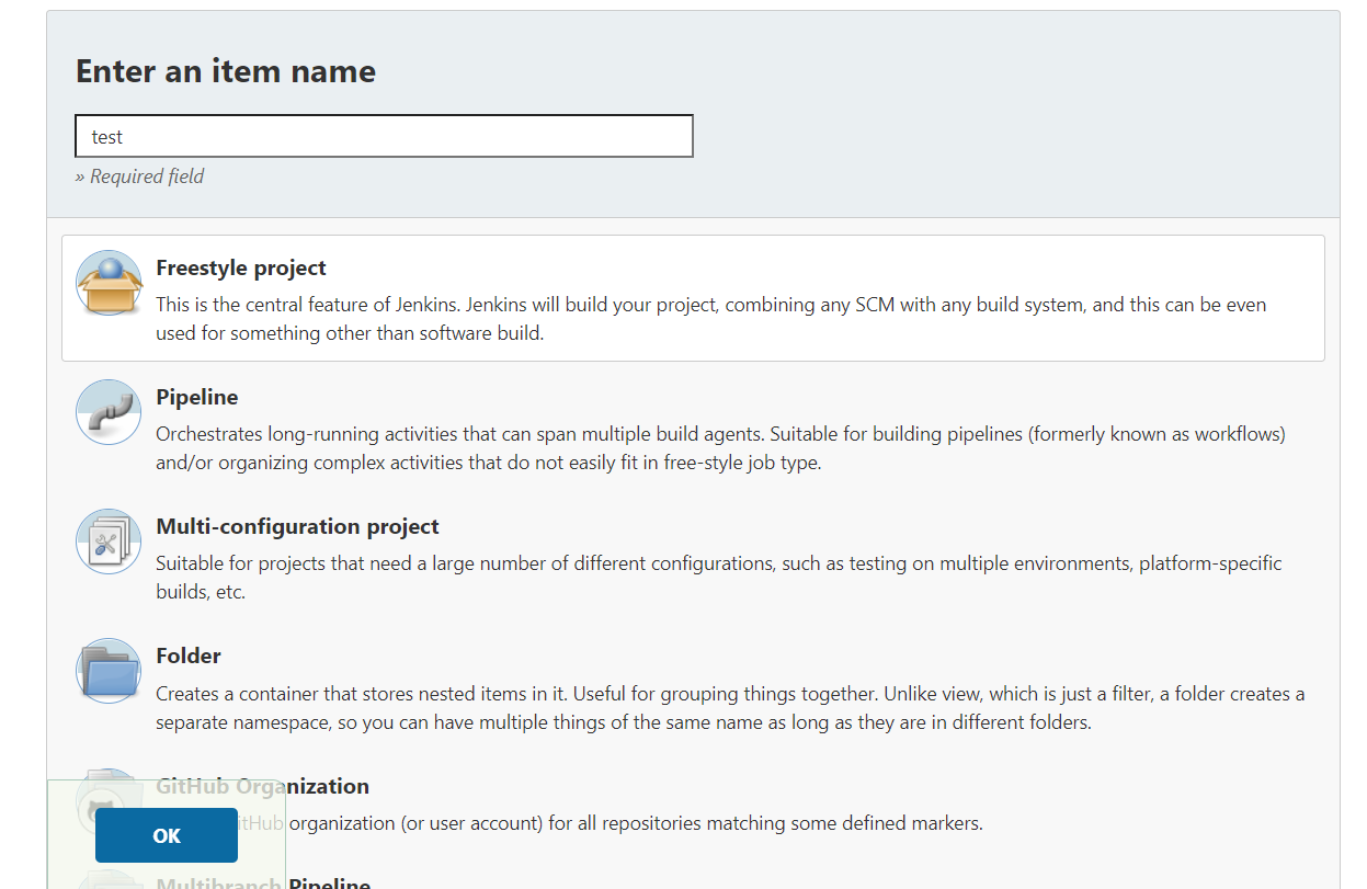 프로젝트의 이름을 적어주고 'Freestyle project'를 클릭한 뒤 OK 해주자