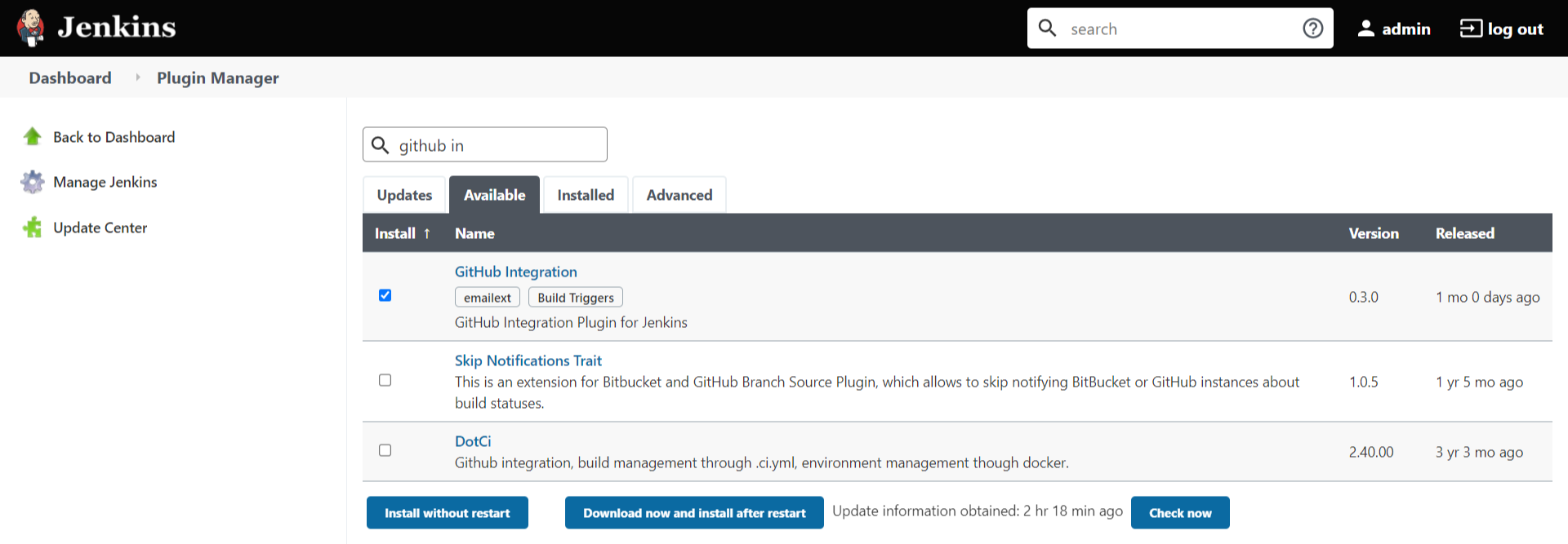 Available 탭을 클릭하고 "GitHub Integration" 이란 플러그인을 설치해주자.