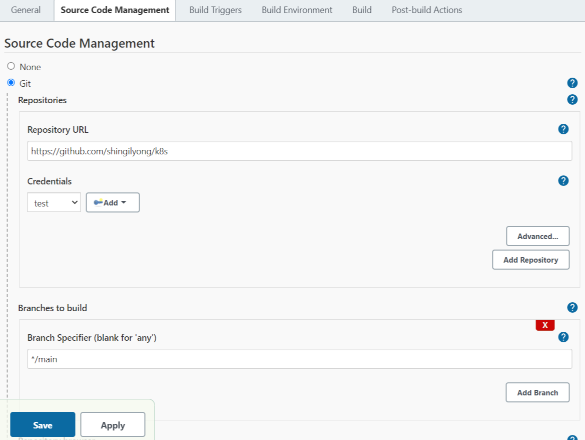 그 후에, Source Code Management에서 'Git'을 선택해주고 Jenkins에서 사용할 Repository의 URL을 입력해준다.