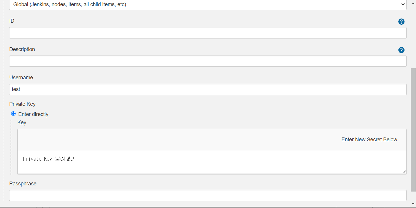 앞에서 Github에 Public Key를 등록해 주었던 것처럼 Jenkins에서도 Private Key를 등록해주어야 한다.