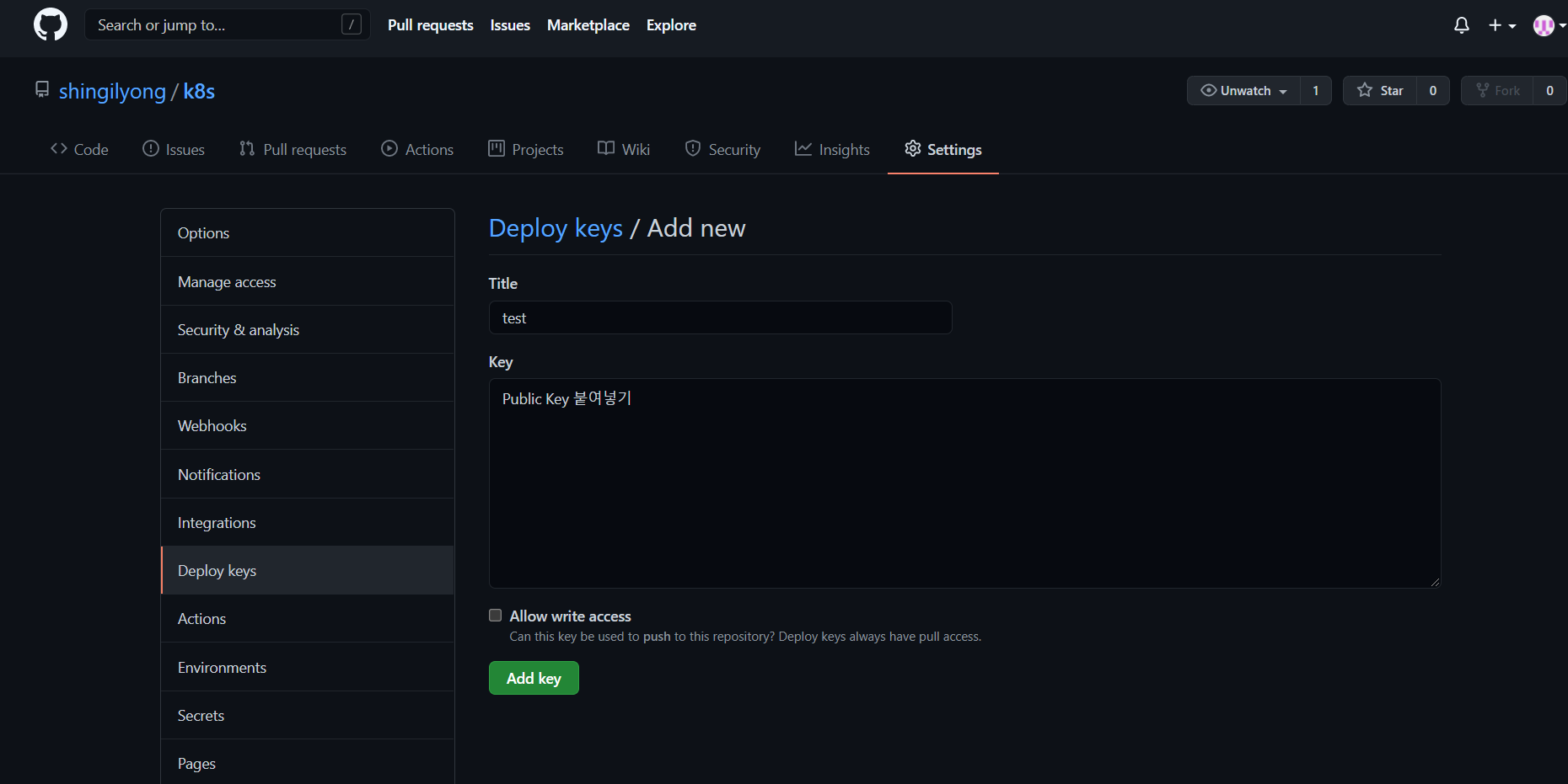 Jenkins에 연동할 git repository에 접속 후, Settings > Deploy Keys를 누르고 'Add deploy Key'를 클릭하여 Public Key를 다음과 같이 등록해주자.
