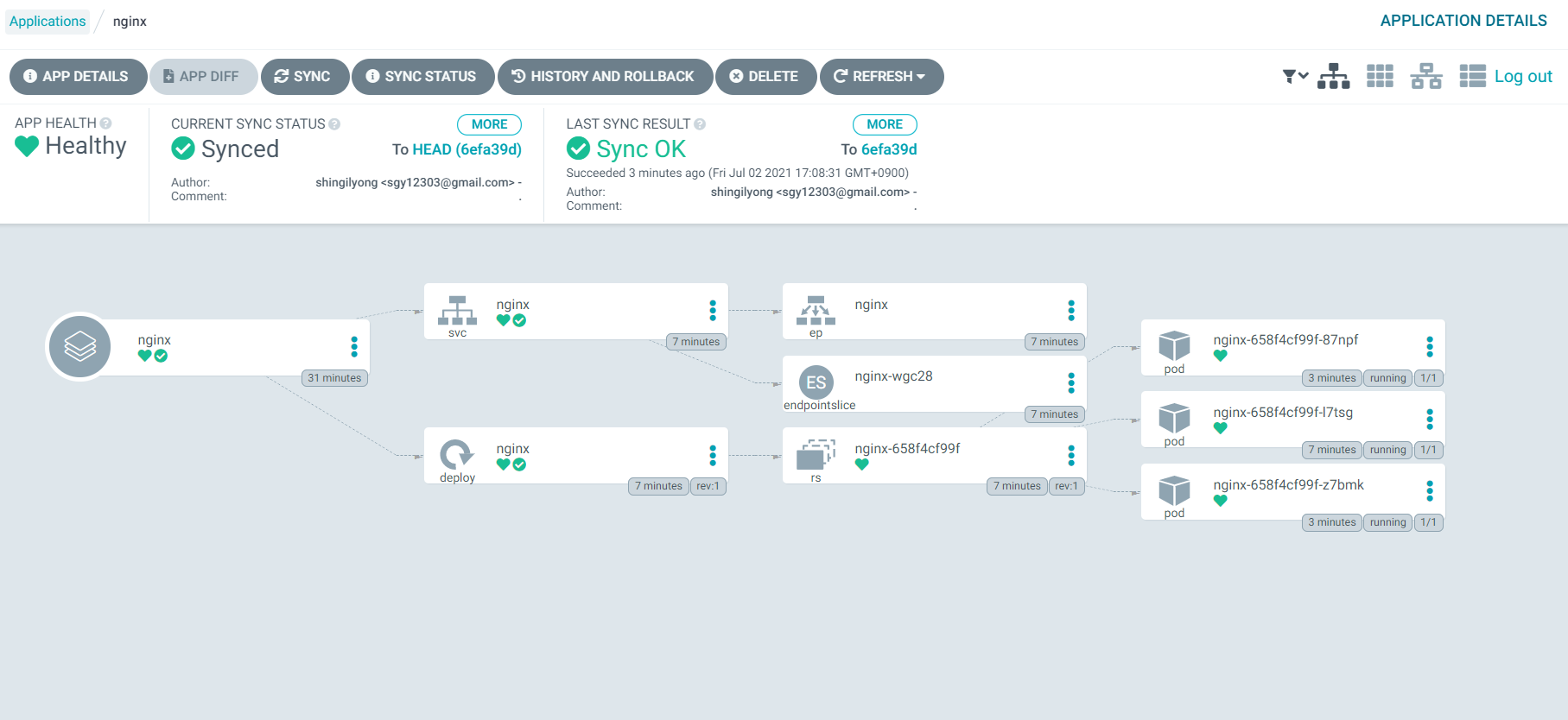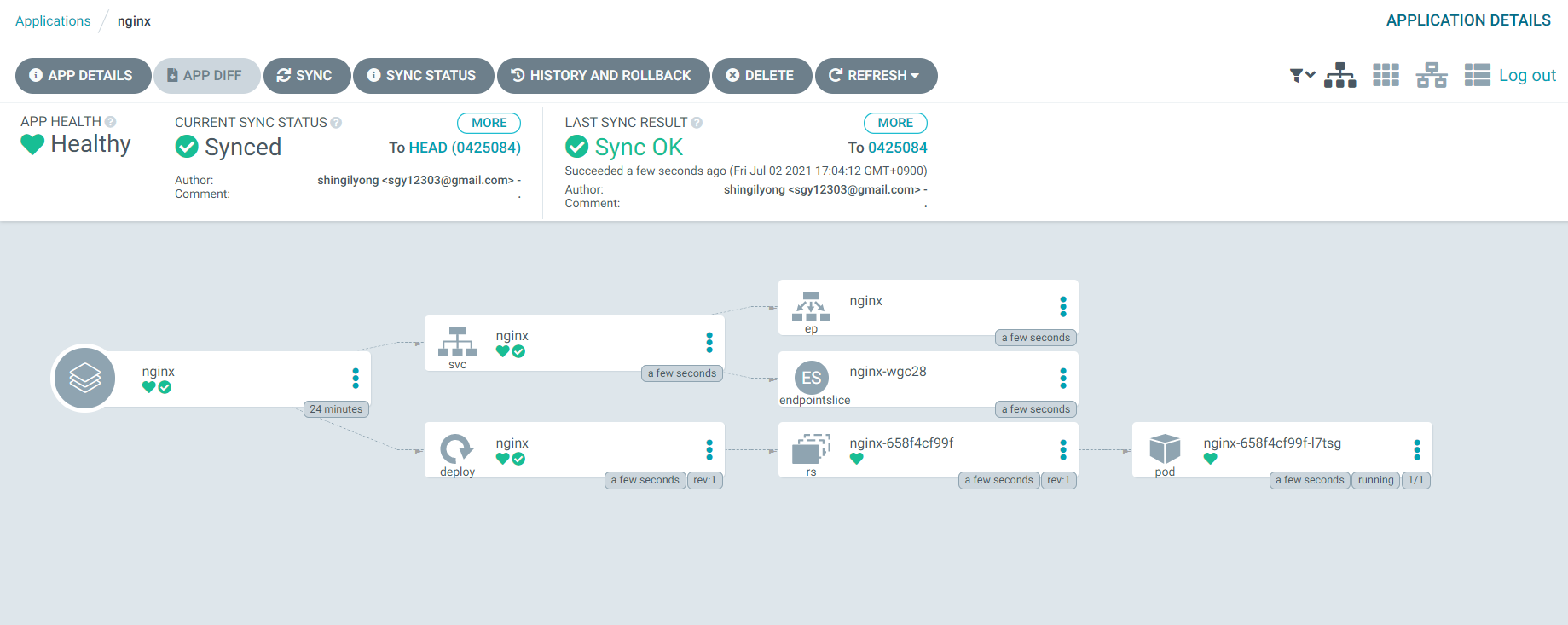 nginx 라는 애플리케이션에 나의 git 레포지토리에 올려두었던 deployment와 service가 배포되어 한개의 pod가 생성되어 있는 모습이다.