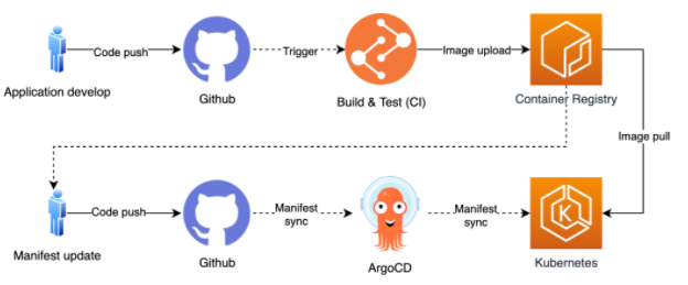 빌드 및 테스트가 끝나는 시점부터 GitOps의 영역으로 진입하면서 Git 레포지토리에 저장되어 있는 Manifest 파일을 사용하여 ArgoCD로 Kubernetes에 배포하게 된다.
