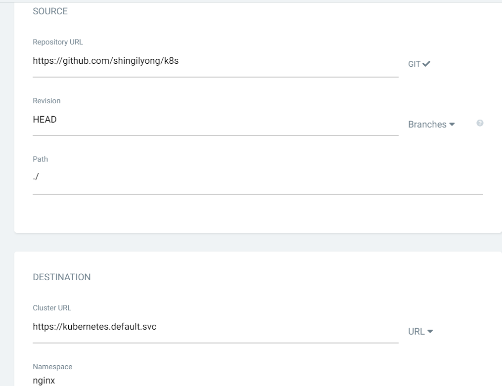 - SYNC POLICY : Manual 과 Automatic 중에 선택하며, Git의 환경과 비교하는 것을 수동으로 할지 자동으로 할지 선택.