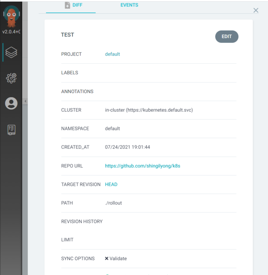 TEST라는 이름으로 yaml 파일이 저장된 레포지토리를 지정해서 새로운 애플리케이션을 배포해주자.