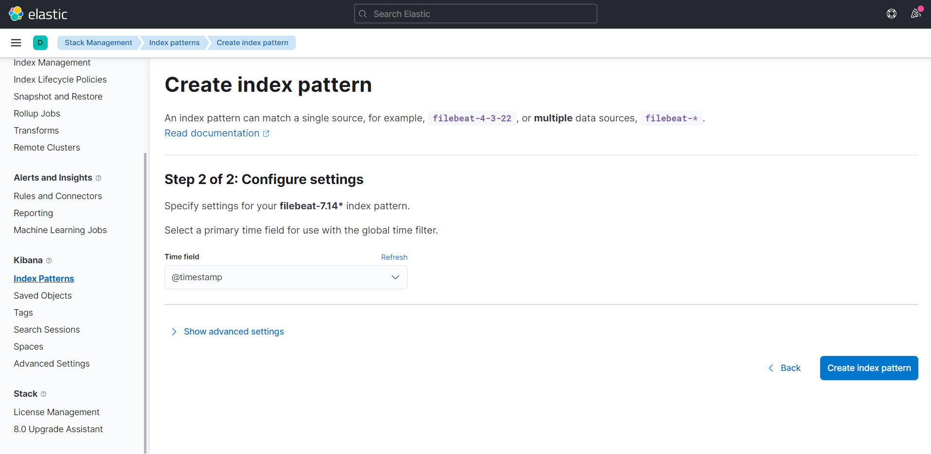 Index pattern name 에 filebeat*를 입력해보면 위에서 설치했던 filebeat-7.14.0 버전이 목록에 있는것을 확인할 수 있다.