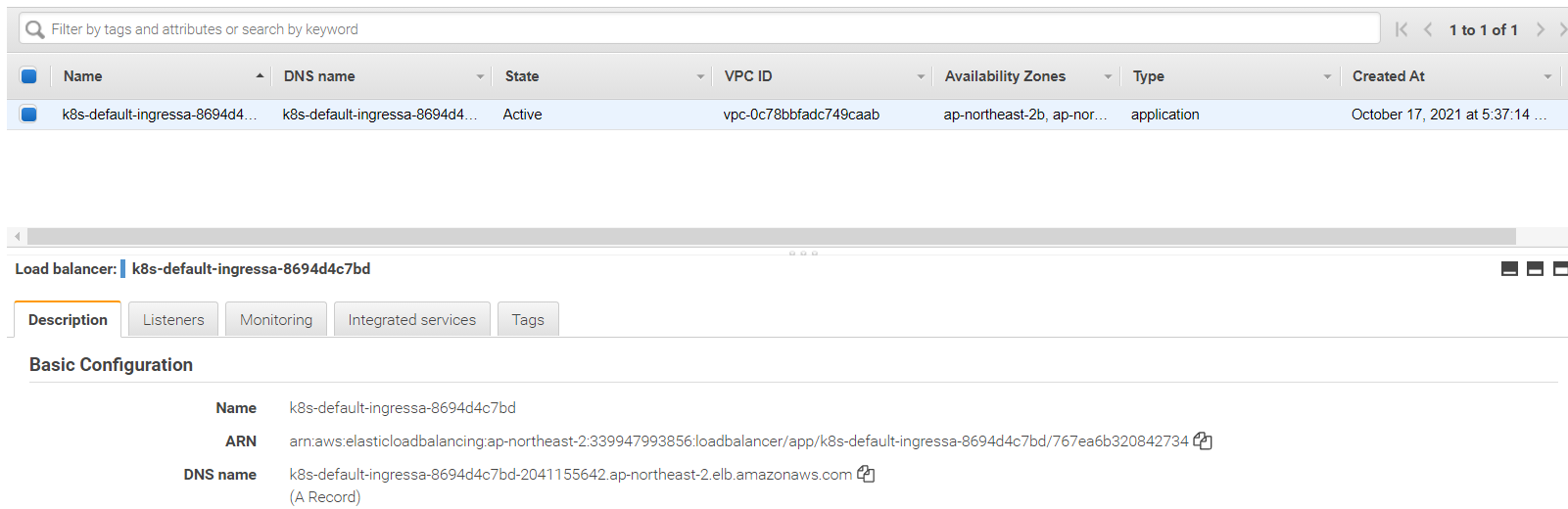 여기서 Ingress가 제대로 생성이 되었다면 AWS 콘솔에서 ALB가 자동으로 생성된 것을 확인할 수 있다.