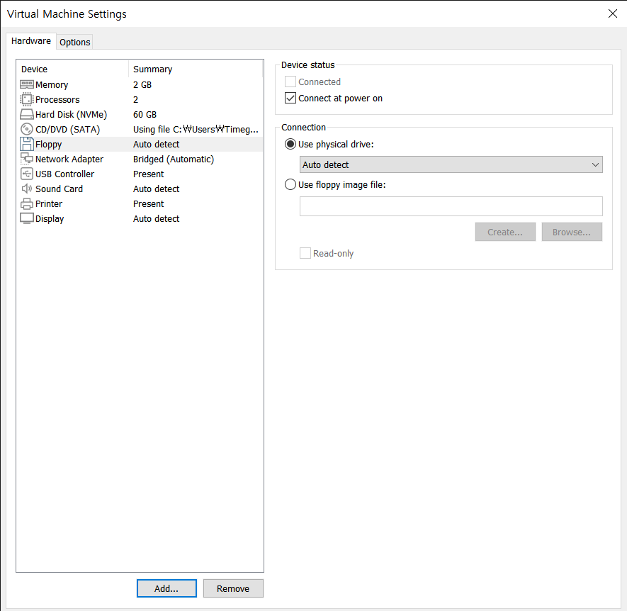 가상머신을 종료시켜준 뒤, Floppy 디스크를 Remove해서 없애주자!!!!