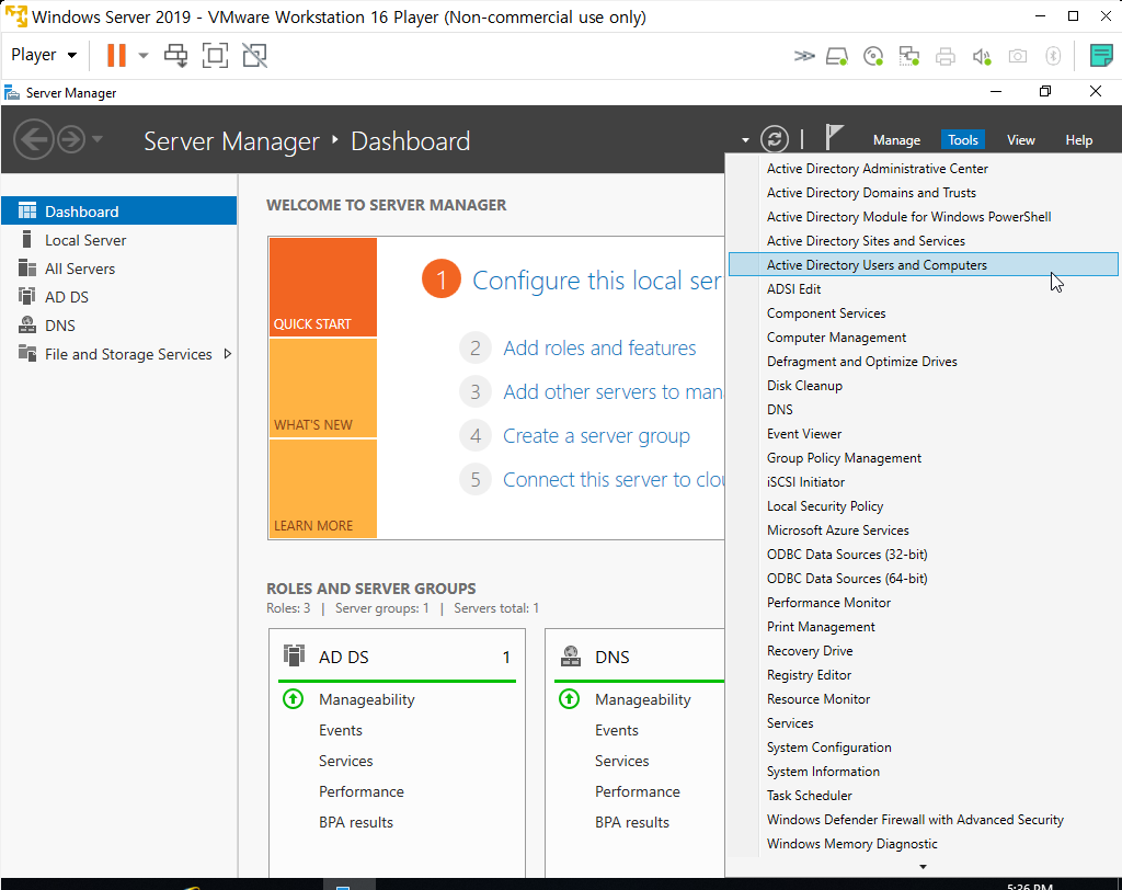 1. Tools > Server Manager > Active Directory Users and Computers 도구를 선택해주자