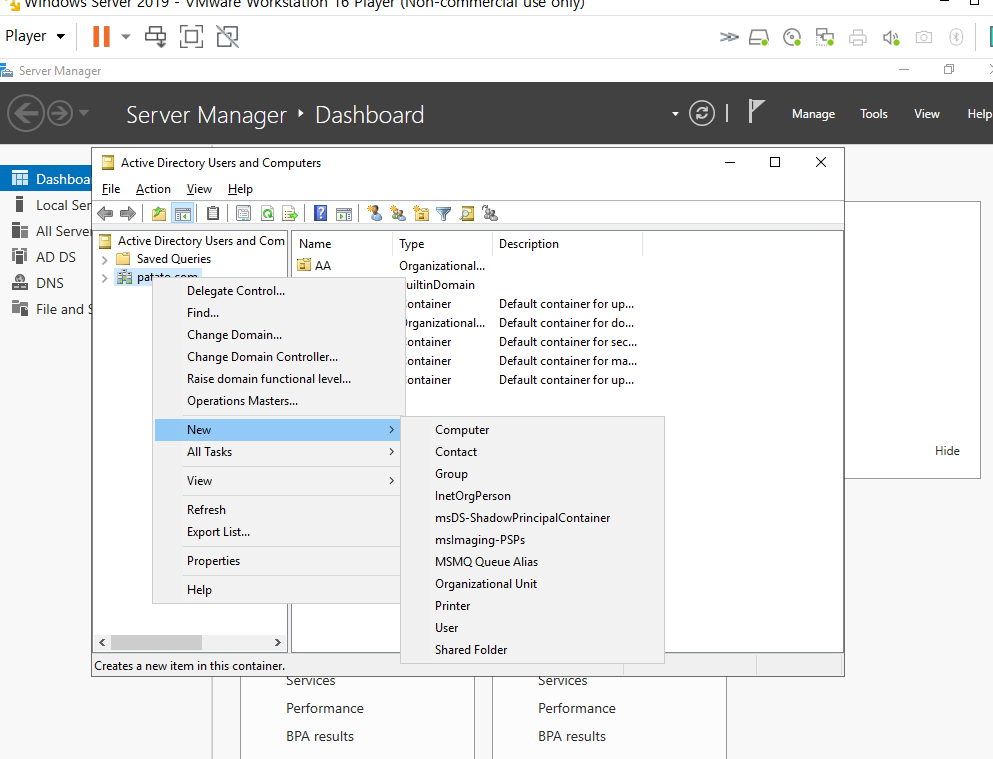 도메인을 마우스 오른쪽으로 클릭한 후 > NEW > Organizational Unit을 눌러주자.
