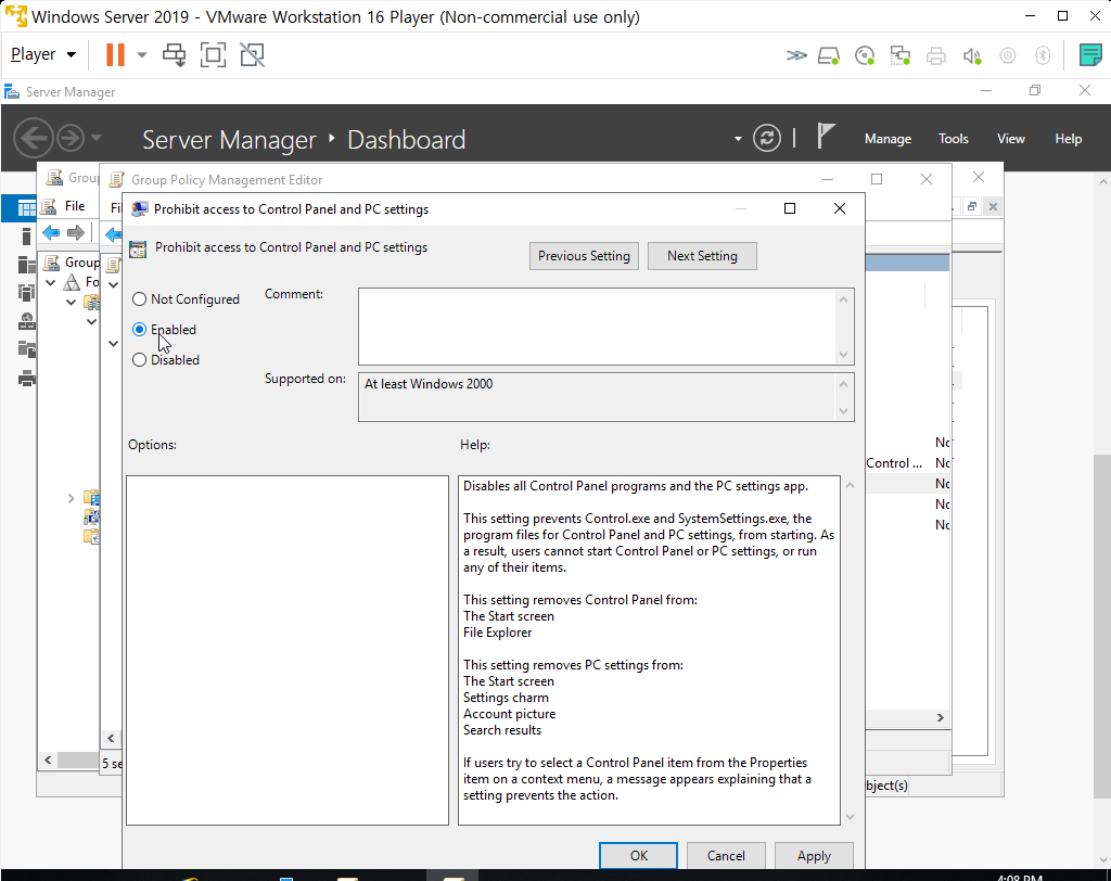 7. User Configuration > Administrative Templates > Control panel > prohibit access to control panel and Pc ssetings