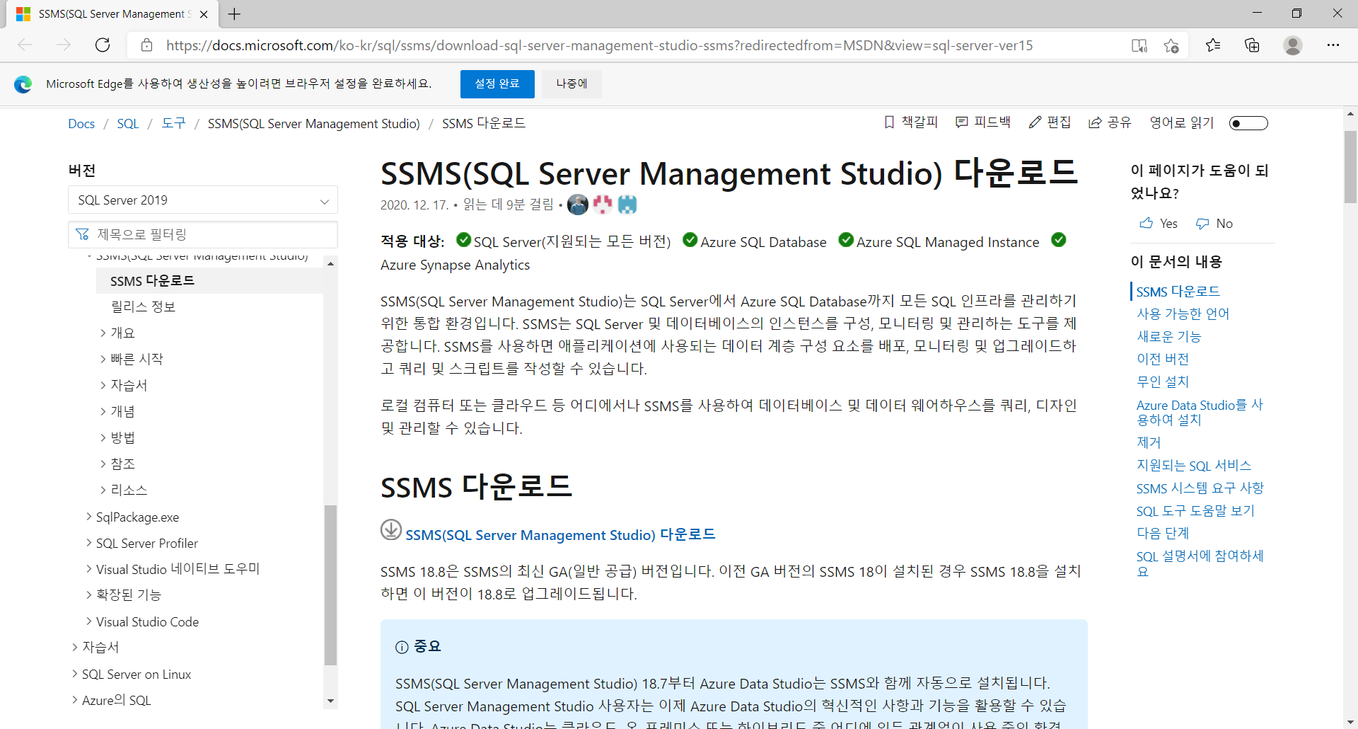 7. SSMS 설치를 누르면 SSMS을 다운받을 수 있는 링크로 접속해진다. 다운로드 해주자.