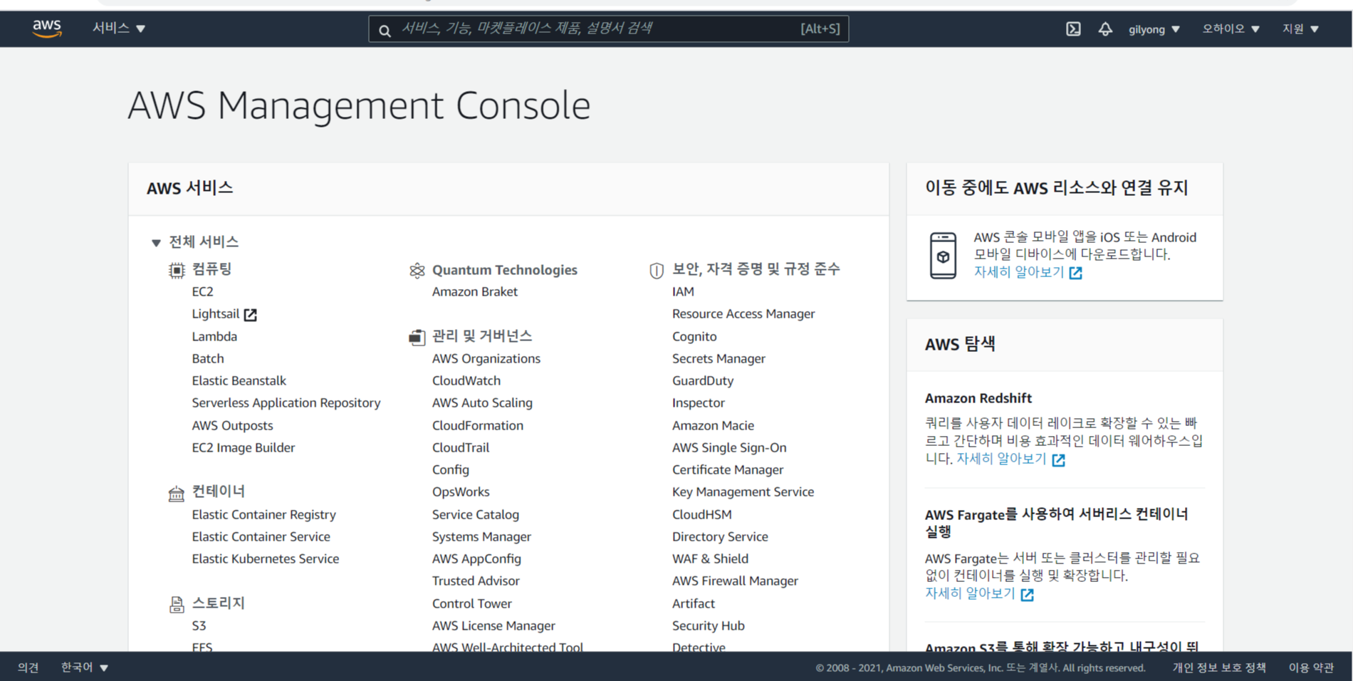 8. 계정에 로그인이 되었다. 이제 AWS의 다양한 서비스들을 이용할 수 있다.