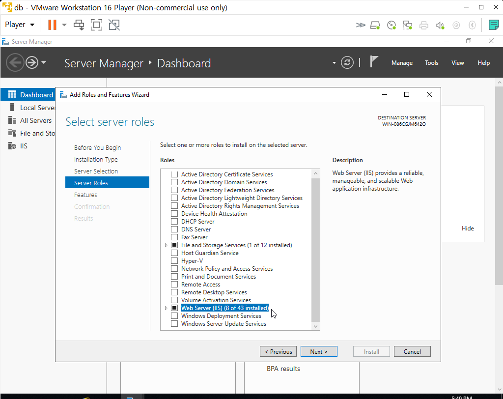 5. Web Server (IIS) 체크해주고 인스톨 눌러주자. (나는 이미 설치를 진행해서 인스톨이 안눌린다..)
