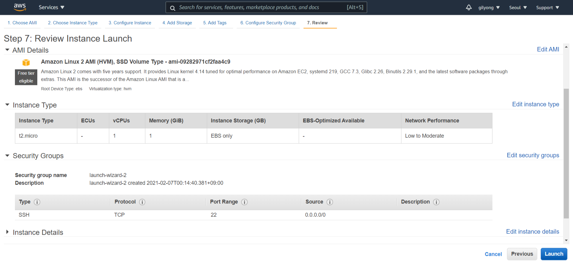 11. 지금까지 설정했었던 인스턴스의 설정들을 확인한다.