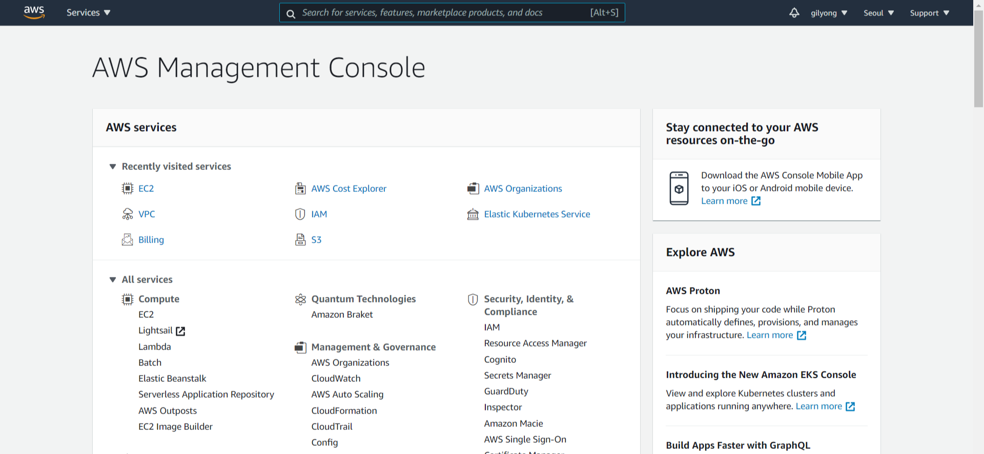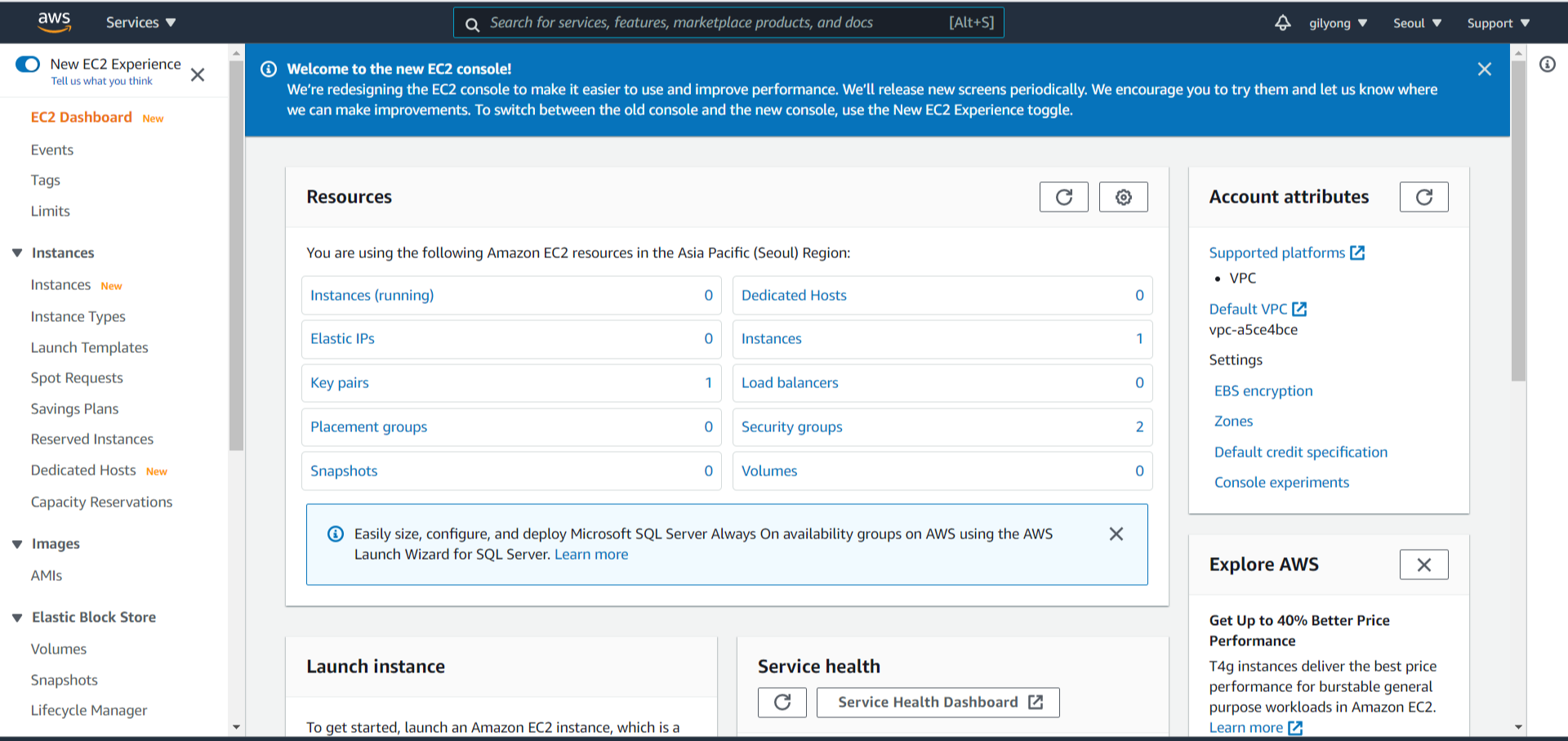1. AWS 계정의 로그인한후 콘솔에 들어가주주면 EC2 항목이 보일것이다. 클릭해주자.
