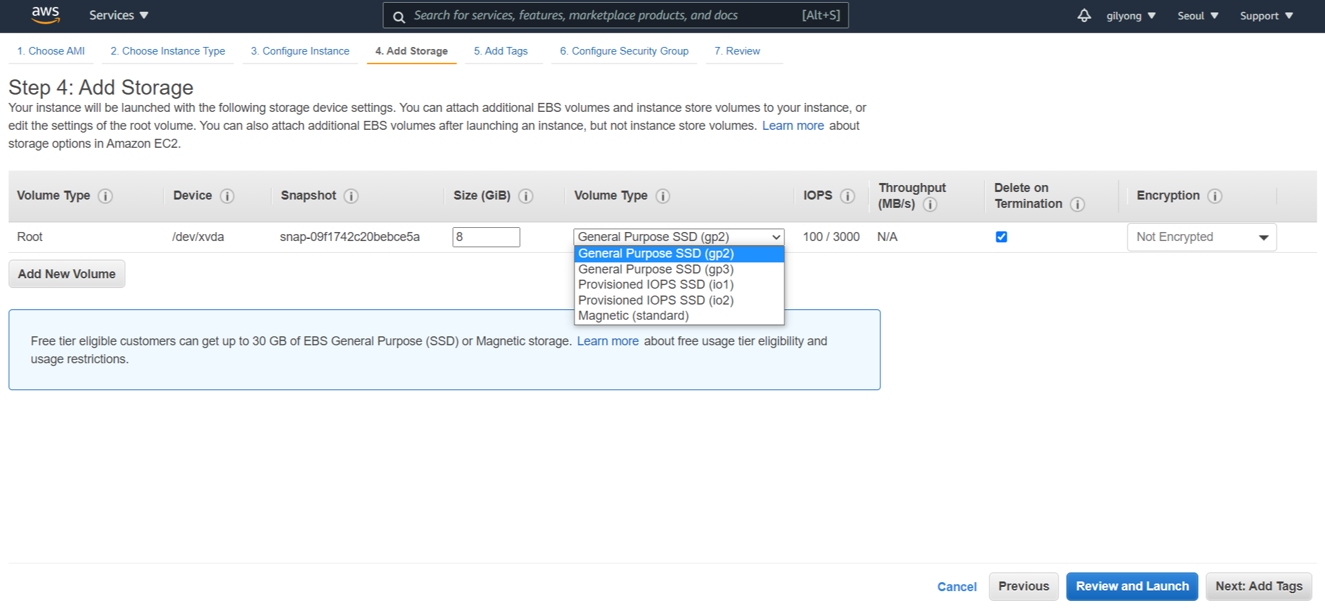 7. 인스턴스에 장착될 스토리지를 설정한다. Root 장치는 반드시 있어야 한다. General Purpose SSD (gp2)를 선택해주었다.