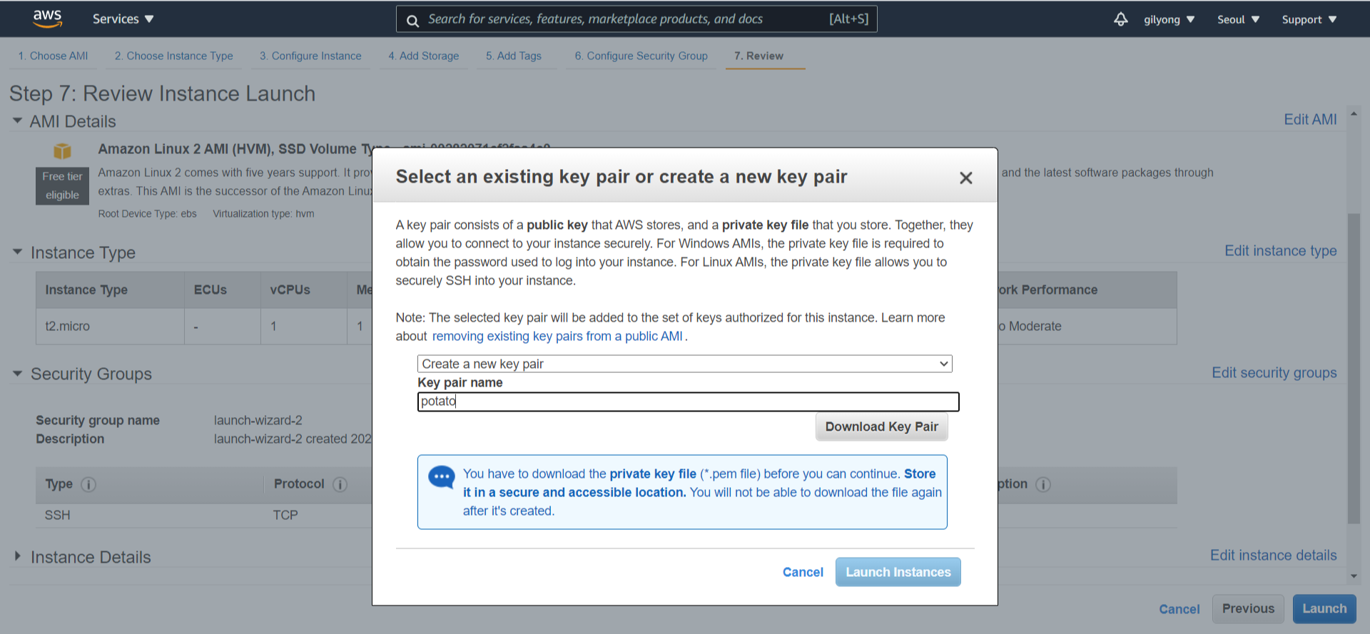 (★다운로드한 Key pair는 항상 잘 보관해 두도록 하자. 잃어버리면 인스턴스 접속을 못한다.)