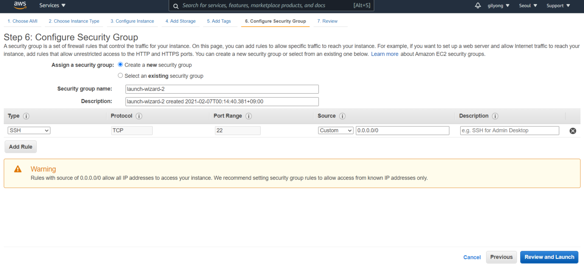 10. 인스턴스의 보안그룹을 설정해주는 과정이다. 새로운 보안그룹을 생성해주자. 기본값으로 SSH 22번 포트가 허용되어 있다.