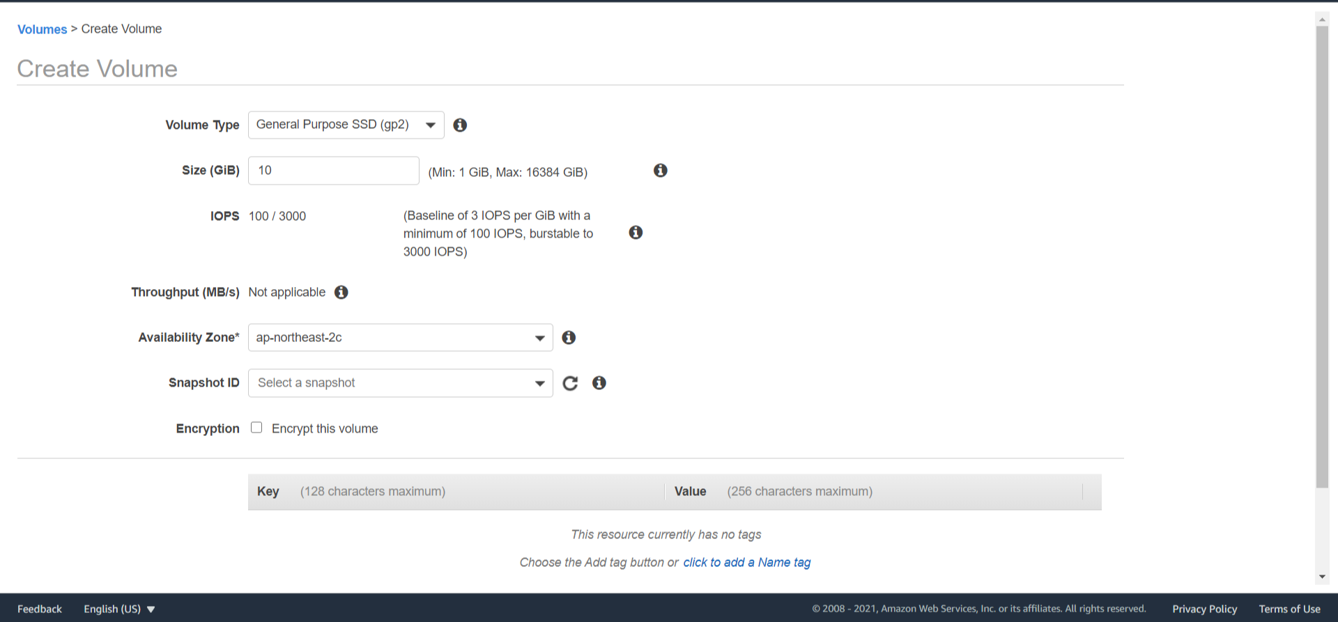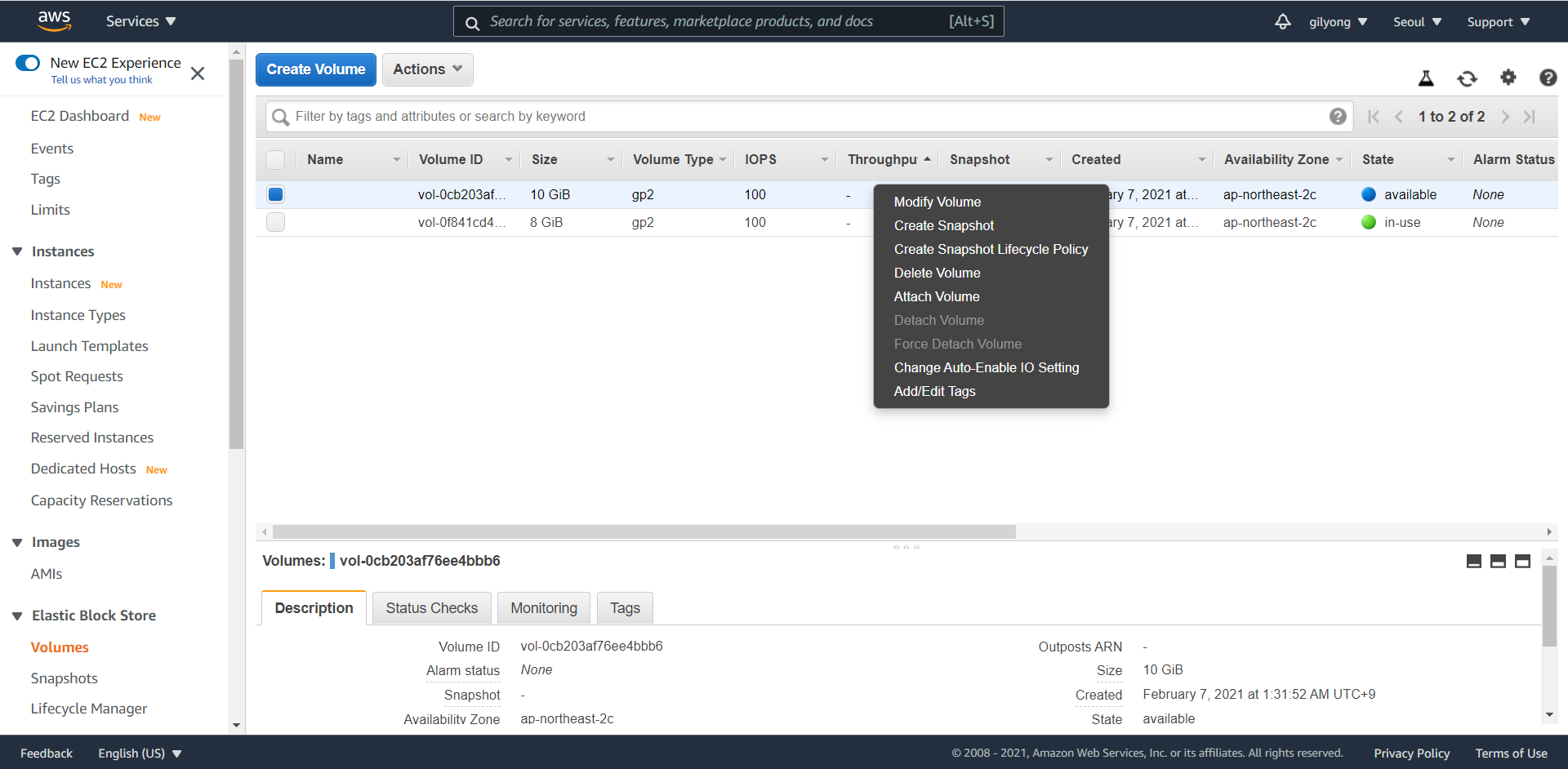 사이즈는 10GB로 가용영역은 ap-northeast-2c로 설정해주었다.