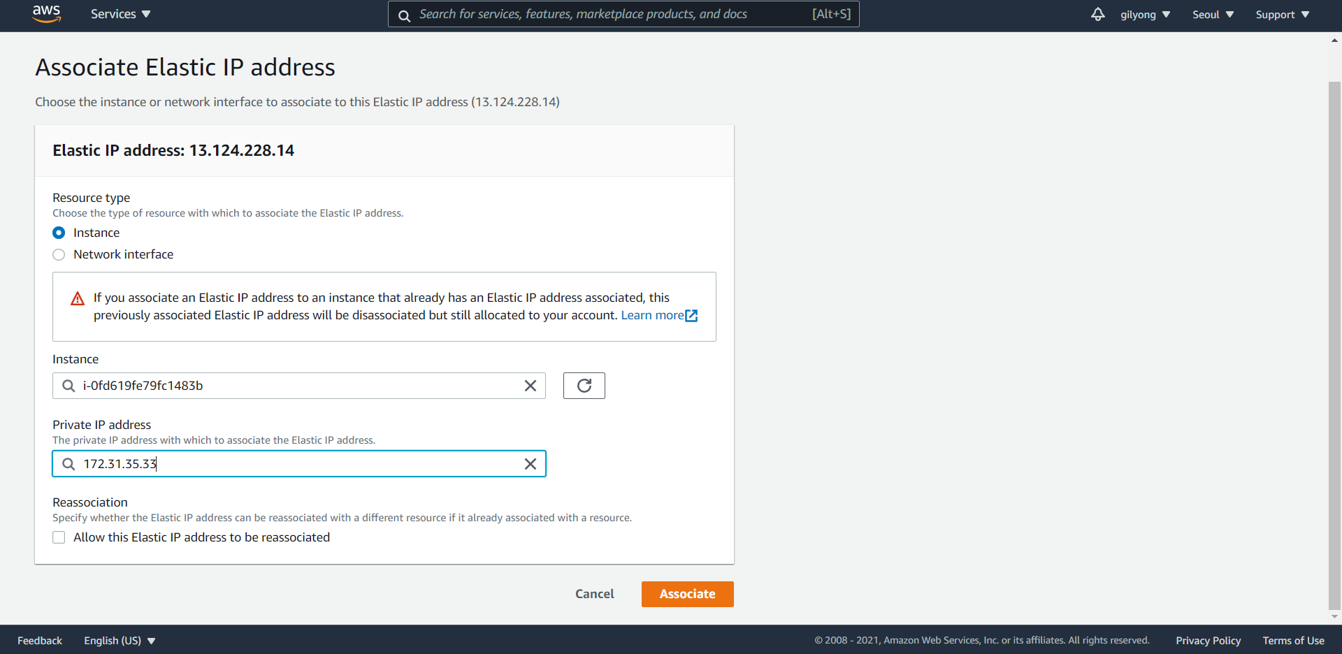 4. Elastic IP에 연결할 인스턴스를 선택해주자. 인스턴스를 선택하면 Private IP 도 선택된다.