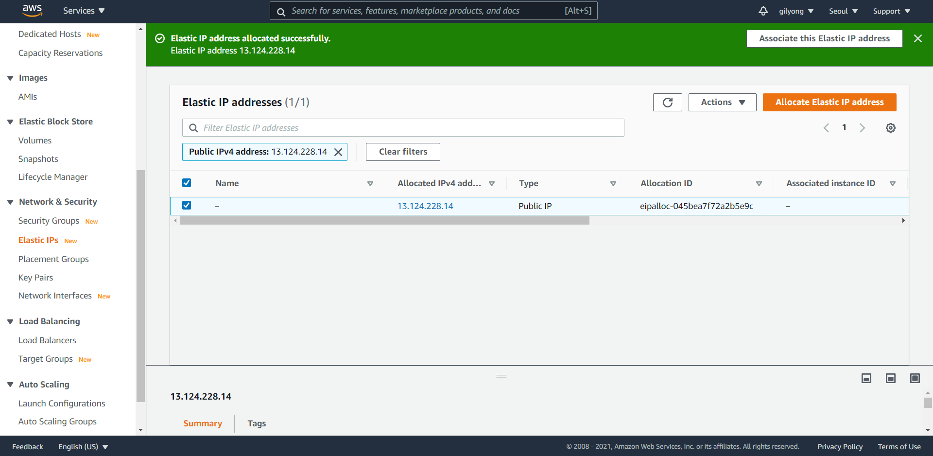 2. Elastic IP를 할당받는건 이렇게나 간단하다. 고정된 IP주소를 확인할 수 있다.