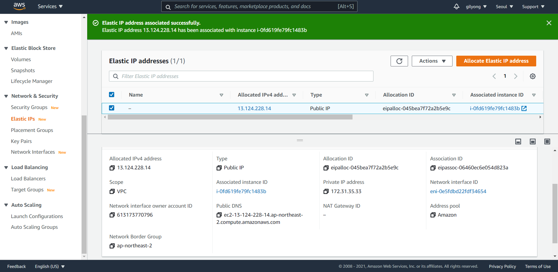5. Elastic IP가 인스턴스에 연결된 것을 확인할 수 있다.