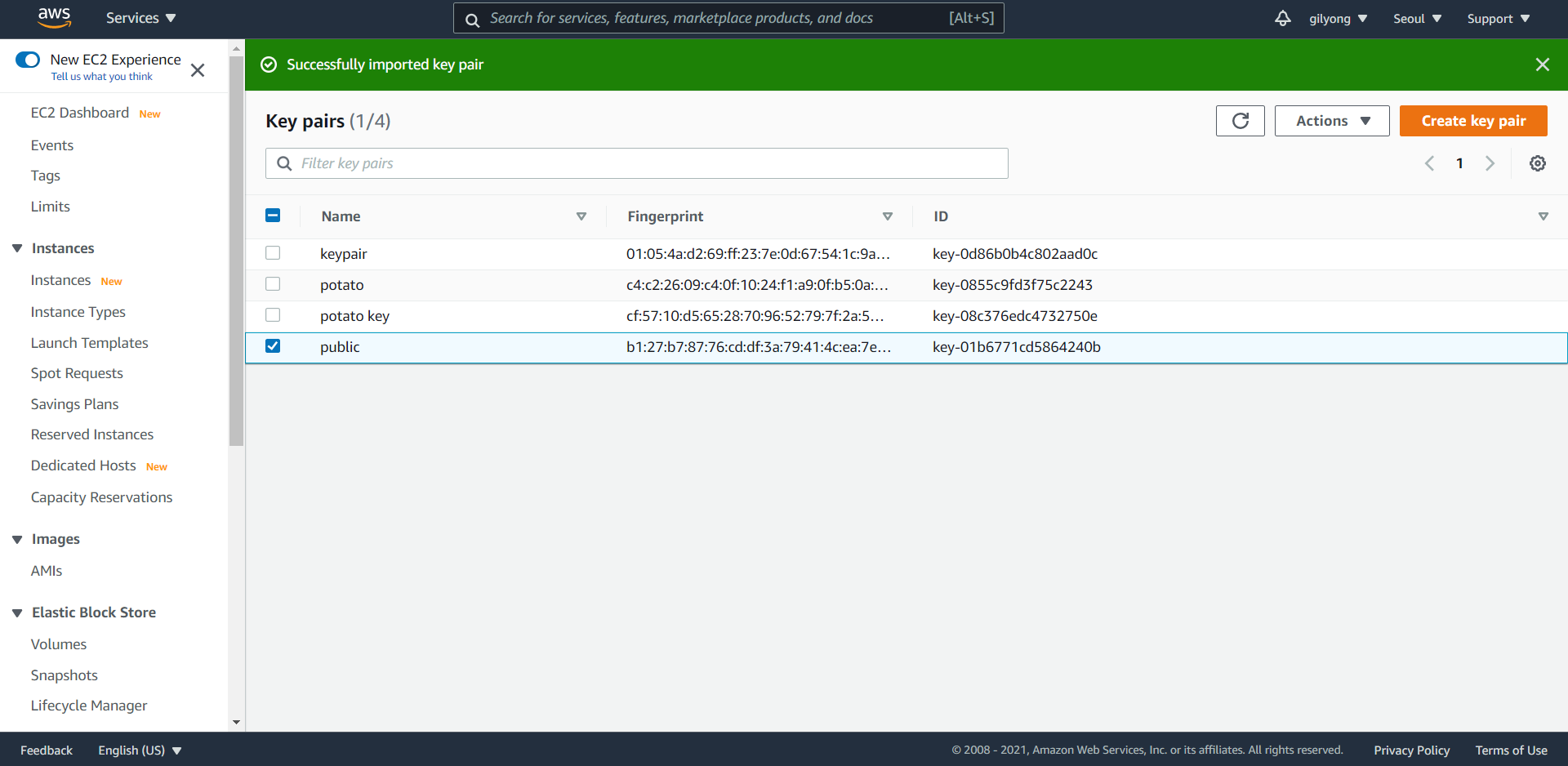 5. Putty로 생성한 key pair를 AWS로 Import 해왔다.