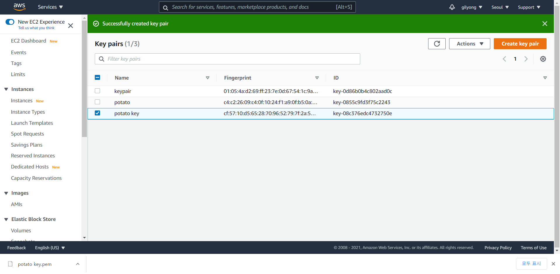 2. potato key라는 이름의 .pem 파일로 Key pair를 생성해주었다.