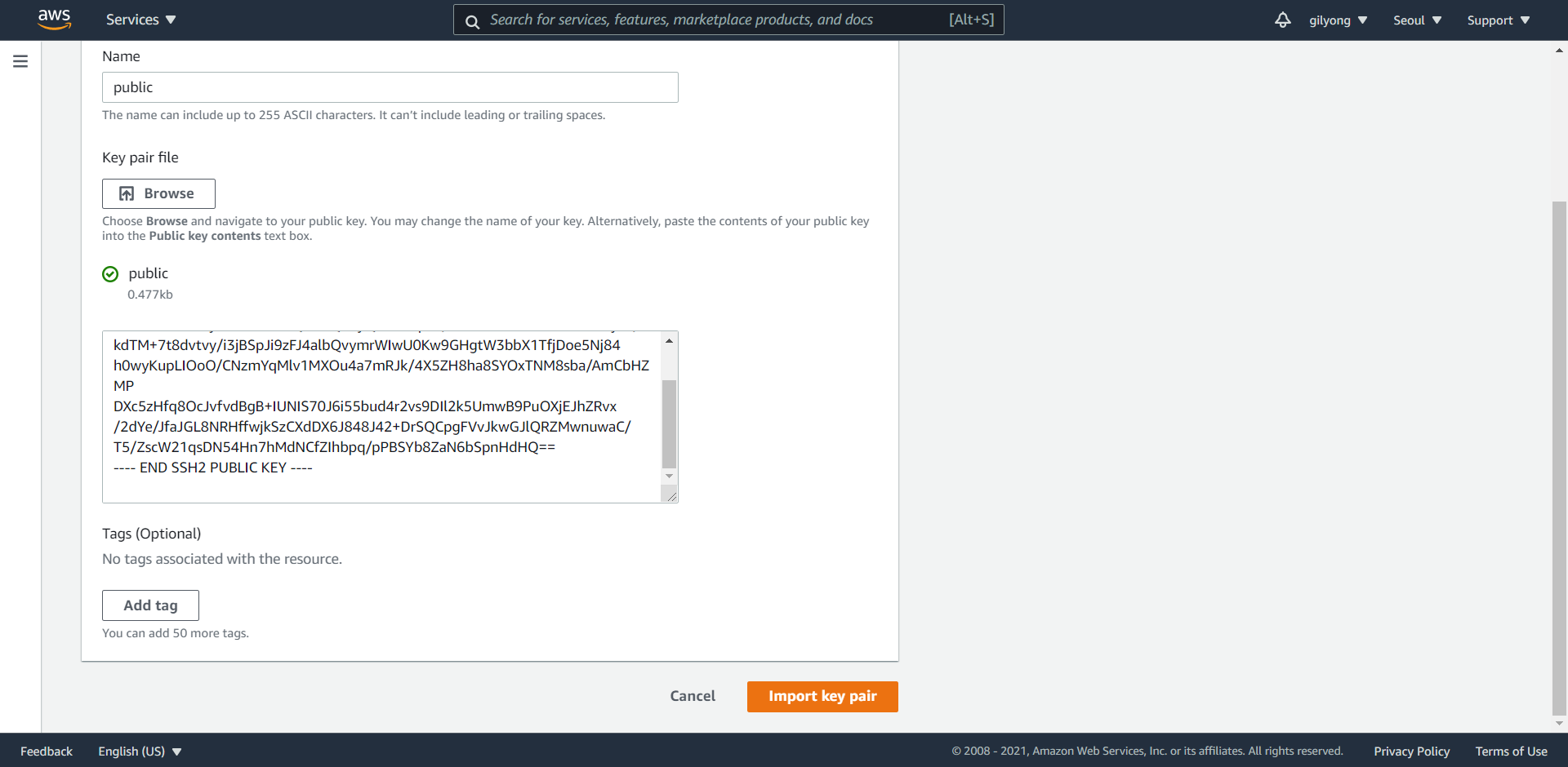 4. Public 이라는 이름으로 putty에서 생성한 Key pair 파일을 넣어주자.