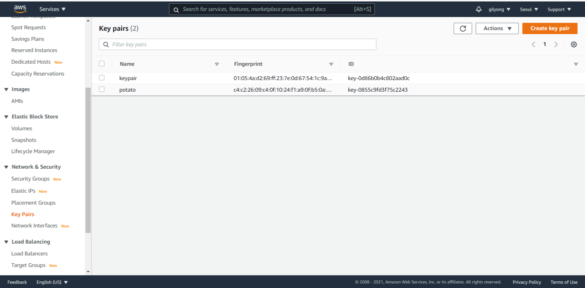 1. EC2 메뉴에서 Network & Security 항목에서 Key Pairs에 들어가 'Create Key pair'를 클릭해 Key Pair를 생성해주자